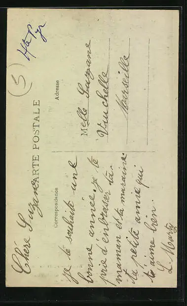 Personenbezogene Daten auf der Rückseite der Karte wurden durch blauen Textmarker unkenntlich gemacht. Die blauen Stellen sind auf die Vorderseite durchgeweicht und wirken sich negativ auf das Postkartenfoto aus