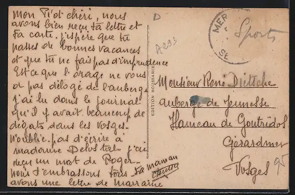 Personenbezogene Daten auf der Rückseite der Karte wurden durch blauen Textmarker unkenntlich gemacht. Die blauen Stellen sind auf die Vorderseite durchgeweicht und wirken sich negativ auf das Postkartenfoto aus