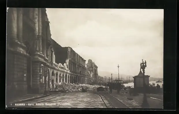 AK Messina, Corso Vittorio Emanuele, Strassenpartie mit zerstörten Häusern nach Erdbeben