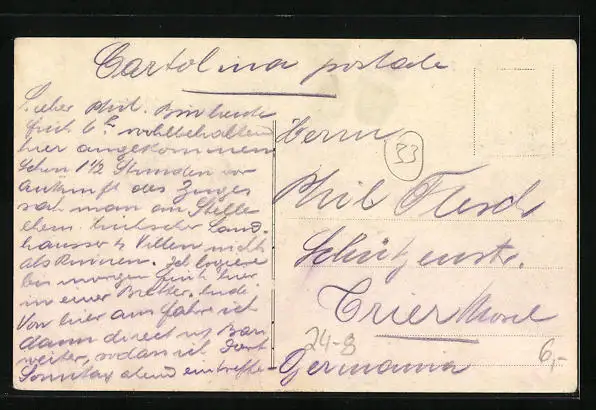 Personenbezogene Daten auf der Rückseite der Karte wurden durch blauen Textmarker unkenntlich gemacht. Die blauen Stellen sind auf die Vorderseite durchgeweicht und wirken sich negativ auf das Postkartenfoto aus