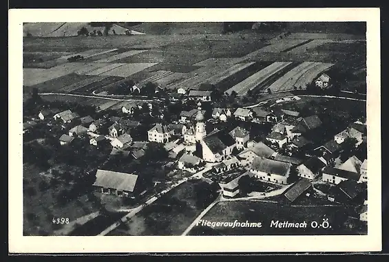AK Mettmach /O.-Ö., Teilansicht mit Kirche, Fliegeraufnahme