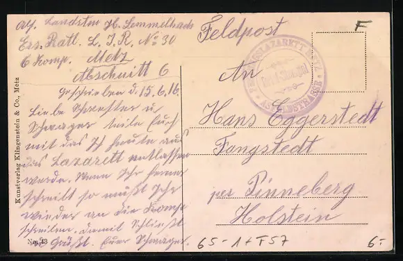 Personenbezogene Daten auf der Rückseite der Karte wurden durch blauen Textmarker unkenntlich gemacht. Die blauen Stellen sind auf die Vorderseite durchgeweicht und wirken sich negativ auf das Postkartenfoto aus