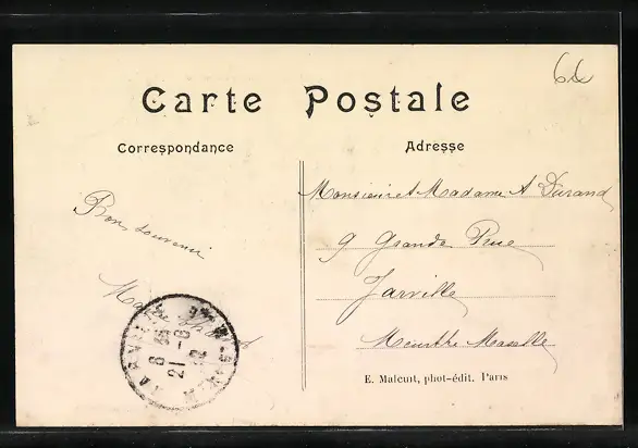Personenbezogene Daten auf der Rückseite der Karte wurden durch blauen Textmarker unkenntlich gemacht. Die blauen Stellen sind auf die Vorderseite durchgeweicht und wirken sich negativ auf das Postkartenfoto aus