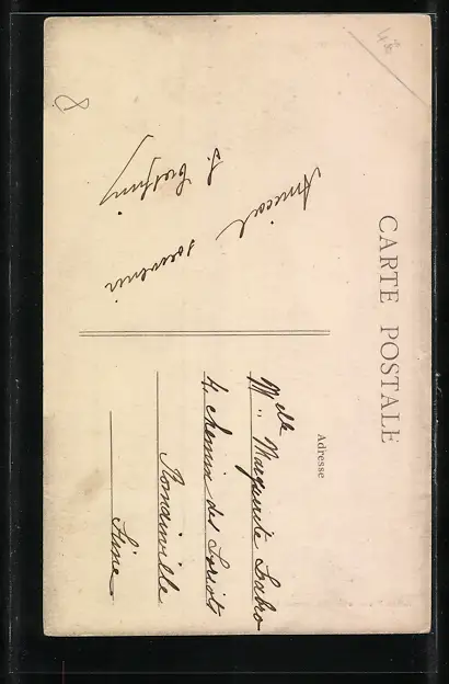 Personenbezogene Daten auf der Rückseite der Karte wurden durch blauen Textmarker unkenntlich gemacht. Die blauen Stellen sind auf die Vorderseite durchgeweicht und wirken sich negativ auf das Postkartenfoto aus