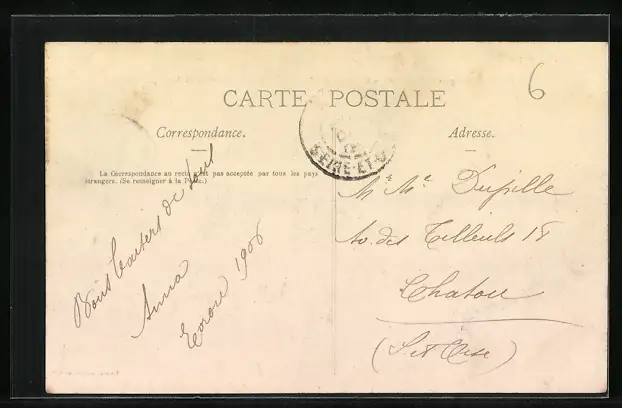 Personenbezogene Daten auf der Rückseite der Karte wurden durch blauen Textmarker unkenntlich gemacht. Die blauen Stellen sind auf die Vorderseite durchgeweicht und wirken sich negativ auf das Postkartenfoto aus