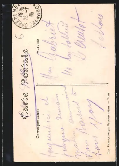 Personenbezogene Daten auf der Rückseite der Karte wurden durch blauen Textmarker unkenntlich gemacht. Die blauen Stellen sind auf die Vorderseite durchgeweicht und wirken sich negativ auf das Postkartenfoto aus