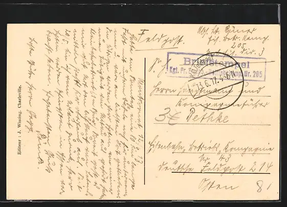 Personenbezogene Daten auf der Rückseite der Karte wurden durch blauen Textmarker unkenntlich gemacht. Die blauen Stellen sind auf die Vorderseite durchgeweicht und wirken sich negativ auf das Postkartenfoto aus