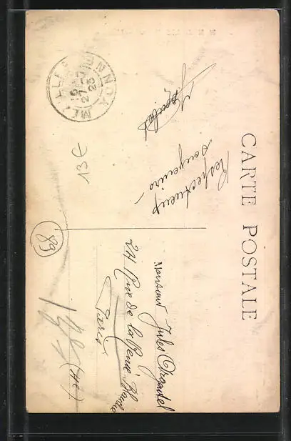 Personenbezogene Daten auf der Rückseite der Karte wurden durch blauen Textmarker unkenntlich gemacht. Die blauen Stellen sind auf die Vorderseite durchgeweicht und wirken sich negativ auf das Postkartenfoto aus