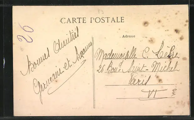 Personenbezogene Daten auf der Rückseite der Karte wurden durch blauen Textmarker unkenntlich gemacht. Die blauen Stellen sind auf die Vorderseite durchgeweicht und wirken sich negativ auf das Postkartenfoto aus