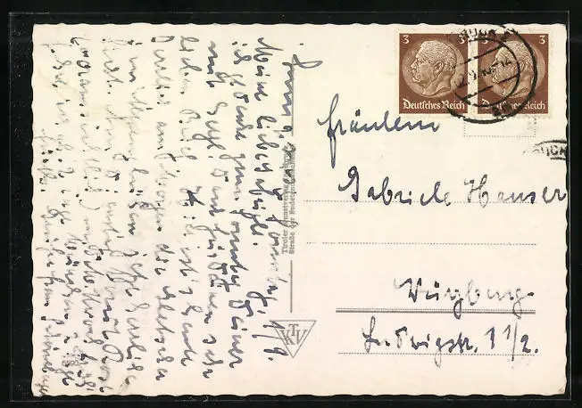 Personenbezogene Daten auf der Rückseite der Karte wurden durch blauen Textmarker unkenntlich gemacht. Die blauen Stellen sind auf die Vorderseite durchgeweicht und wirken sich negativ auf das Postkartenfoto aus