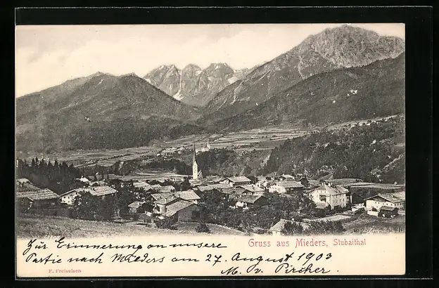 AK Mieders /Stubaithal, Ortsansicht mit Kirche gegen Bergkette