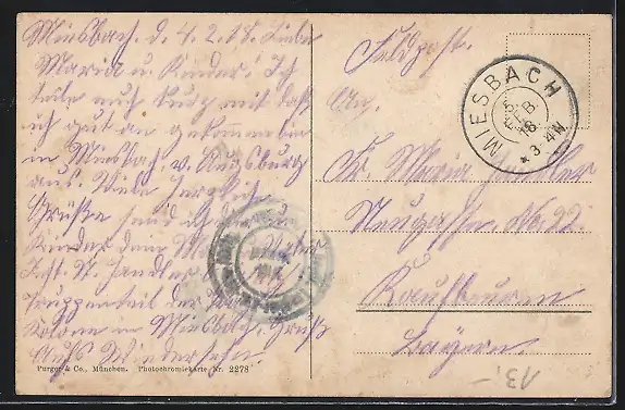 alte Ansichtskarte, gelaufen 1918, Abriebspuren. re oben und li. unten, guter Zustand