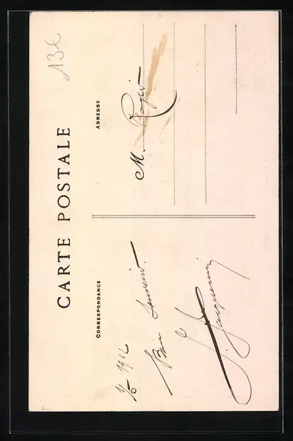 Personenbezogene Daten auf der Rückseite der Karte wurden durch blauen Textmarker unkenntlich gemacht. Die blauen Stellen sind auf die Vorderseite durchgeweicht und wirken sich negativ auf das Postkartenfoto aus