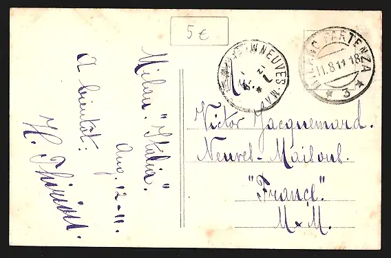 Personenbezogene Daten auf der Rückseite der Karte wurden durch blauen Textmarker unkenntlich gemacht. Die blauen Stellen sind auf die Vorderseite durchgeweicht und wirken sich negativ auf das Postkartenfoto aus