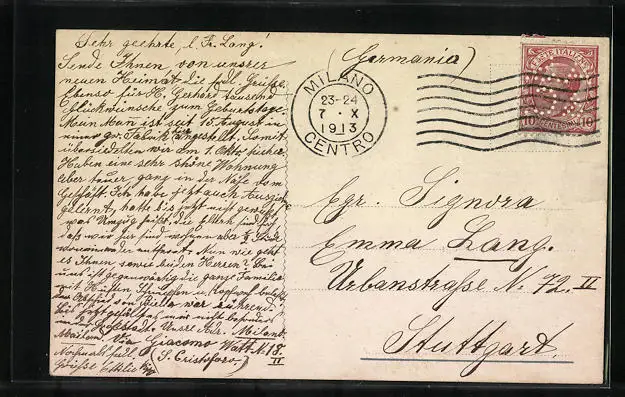 Personenbezogene Daten auf der Rückseite der Karte wurden durch blauen Textmarker unkenntlich gemacht. Die blauen Stellen sind auf die Vorderseite durchgeweicht und wirken sich negativ auf das Postkartenfoto aus