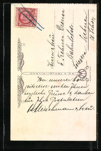 Personenbezogene Daten auf der Rückseite der Karte wurden durch blauen Textmarker unkenntlich gemacht. Die blauen Stellen sind auf die Vorderseite durchgeweicht und wirken sich negativ auf das Postkartenfoto aus