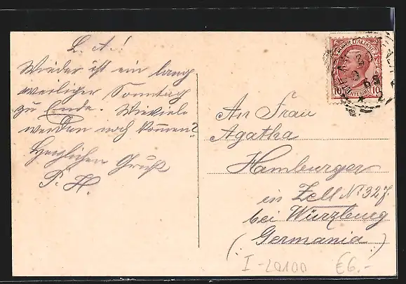 Personenbezogene Daten auf der Rückseite der Karte wurden durch blauen Textmarker unkenntlich gemacht. Die blauen Stellen sind auf die Vorderseite durchgeweicht und wirken sich negativ auf das Postkartenfoto aus