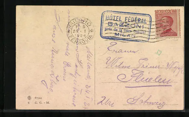Personenbezogene Daten auf der Rückseite der Karte wurden durch blauen Textmarker unkenntlich gemacht. Die blauen Stellen sind auf die Vorderseite durchgeweicht und wirken sich negativ auf das Postkartenfoto aus