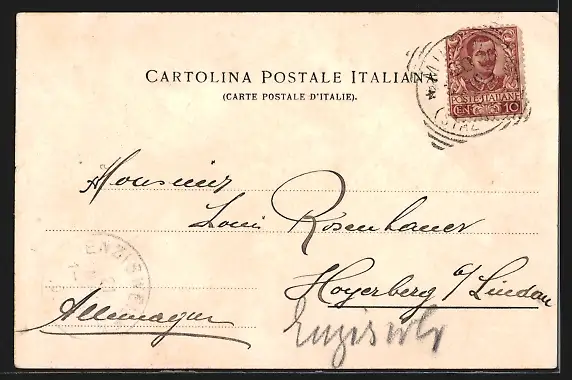 Personenbezogene Daten auf der Rückseite der Karte wurden durch blauen Textmarker unkenntlich gemacht. Die blauen Stellen sind auf die Vorderseite durchgeweicht und wirken sich negativ auf das Postkartenfoto aus