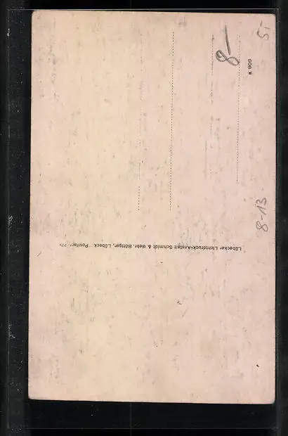 Personenbezogene Daten auf der Rückseite der Karte wurden durch blauen Textmarker unkenntlich gemacht. Die blauen Stellen sind auf die Vorderseite durchgeweicht und wirken sich negativ auf das Postkartenfoto aus