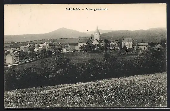 AK Millay, vue générale du village avec église et collines en arrière-plan