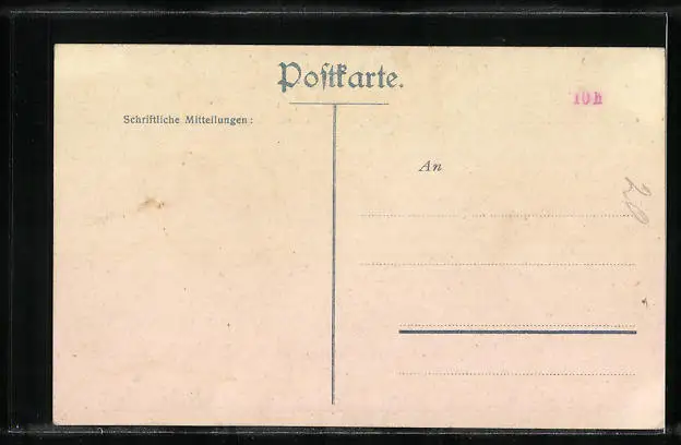 Personenbezogene Daten auf der Rückseite der Karte wurden durch blauen Textmarker unkenntlich gemacht. Die blauen Stellen sind auf die Vorderseite durchgeweicht und wirken sich negativ auf das Postkartenfoto aus