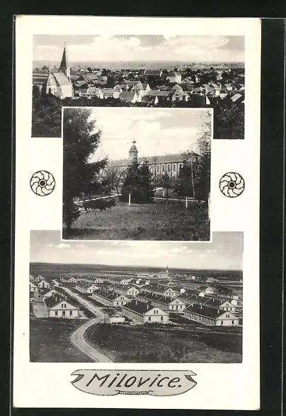 AK Milowitz / Milovice, Drei Ansichten des Ortes