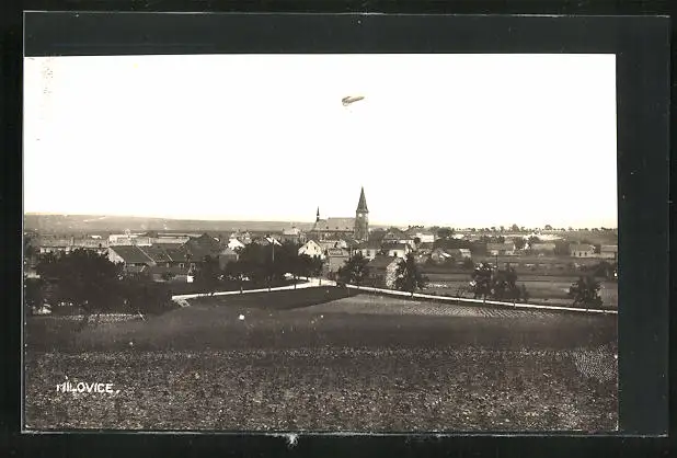 AK Milowitz / Milovice, Teilansicht mit Kirche und Zeppelin