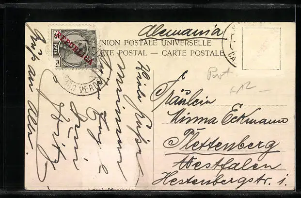 alte Ansichtskarte, gelaufen, Briefmarke tw. entfernt, rückseitig Oberflächenschaden, Stempelspur, guter Zustand