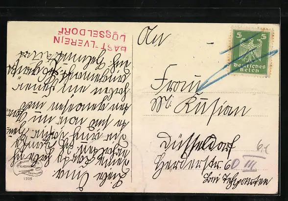 Personenbezogene Daten auf der Rückseite der Karte wurden durch blauen Textmarker unkenntlich gemacht. Die blauen Stellen sind auf die Vorderseite durchgeweicht und wirken sich negativ auf das Postkartenfoto aus