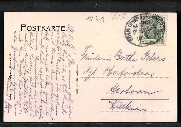 Personenbezogene Daten auf der Rückseite der Karte wurden durch blauen Textmarker unkenntlich gemacht. Die blauen Stellen sind auf die Vorderseite durchgeweicht und wirken sich negativ auf das Postkartenfoto aus
