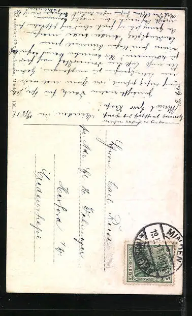 Personenbezogene Daten auf der Rückseite der Karte wurden durch blauen Textmarker unkenntlich gemacht. Die blauen Stellen sind auf die Vorderseite durchgeweicht und wirken sich negativ auf das Postkartenfoto aus