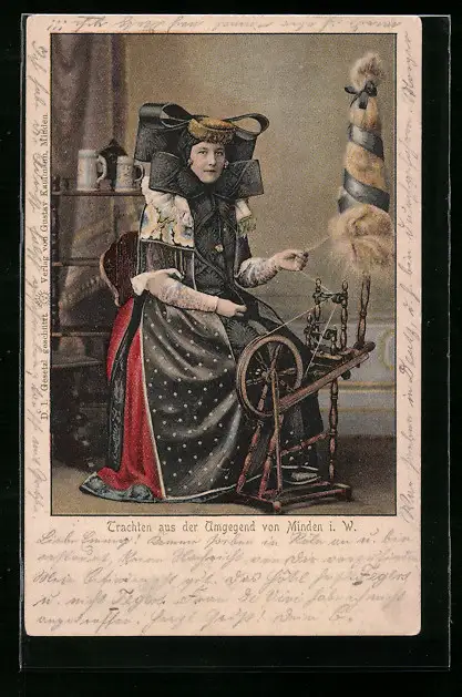 AK Minden i. W., Frau in Tracht am Spinnrad