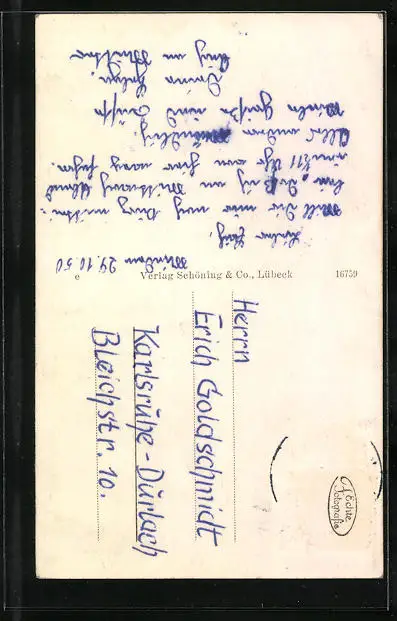 Personenbezogene Daten auf der Rückseite der Karte wurden durch blauen Textmarker unkenntlich gemacht. Die blauen Stellen sind auf die Vorderseite durchgeweicht und wirken sich negativ auf das Postkartenfoto aus