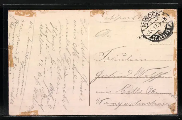 alte Ansichtskarte, gelaufen 1917 als Feldpost, rückseitig Klebe- und Papierreste, guter Zustand