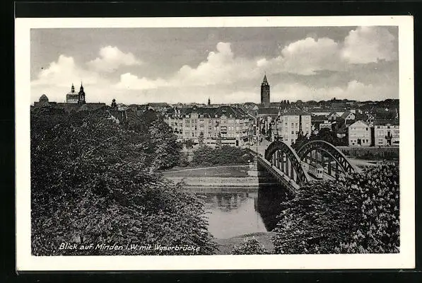 AK Minden i. W., Ortsansicht mit Strassenbahn auf der Weserbrücke