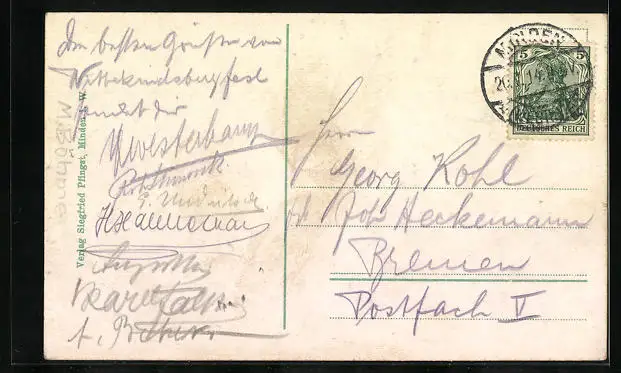 Personenbezogene Daten auf der Rückseite der Karte wurden durch blauen Textmarker unkenntlich gemacht. Die blauen Stellen sind auf die Vorderseite durchgeweicht und wirken sich negativ auf das Postkartenfoto aus