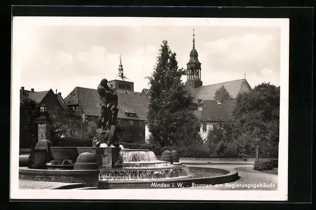 AK Minden i. W., das Regierungsgebäude hinter dem Brunnen