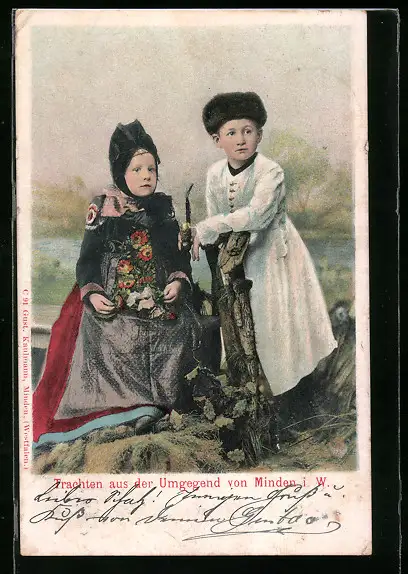 AK Minden i. w., Junge mit Tabakspfeife und Mädchen in Tracht