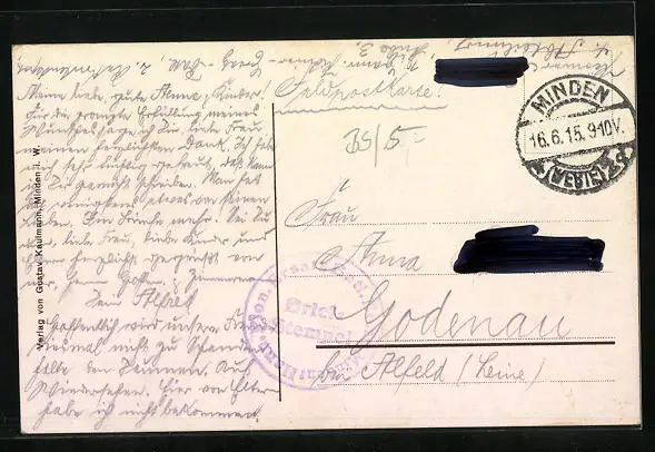 Personenbezogene Daten auf der Rückseite der Karte wurden durch blauen Textmarker unkenntlich gemacht. Die blauen Stellen sind auf die Vorderseite durchgeweicht und wirken sich negativ auf das Postkartenfoto aus