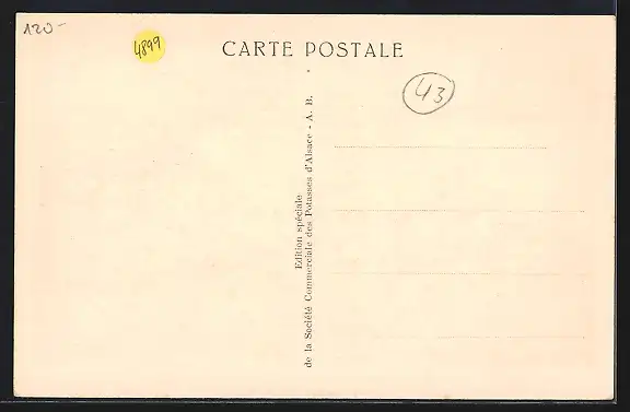 Personenbezogene Daten auf der Rückseite der Karte wurden durch blauen Textmarker unkenntlich gemacht. Die blauen Stellen sind auf die Vorderseite durchgeweicht und wirken sich negativ auf das Postkartenfoto aus