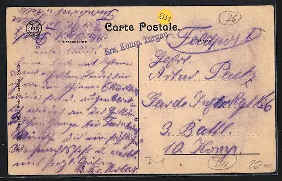Personenbezogene Daten auf der Rückseite der Karte wurden durch blauen Textmarker unkenntlich gemacht. Die blauen Stellen sind auf die Vorderseite durchgeweicht und wirken sich negativ auf das Postkartenfoto aus