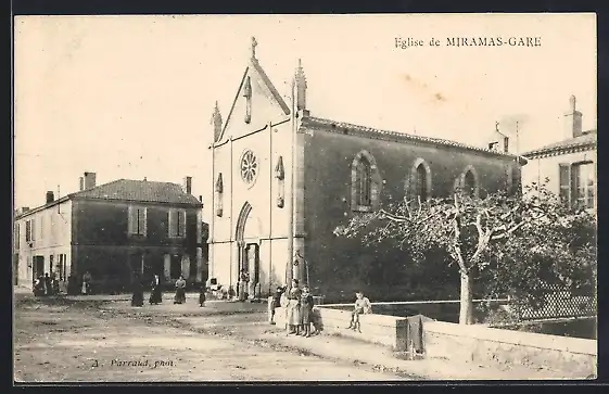 AK Miramas, Église de Miramas-Gare avec passants devant l`église