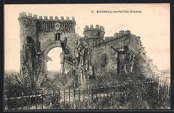 AK Mirebeau-en-Poitou, Vue du portail fortifié et statues médiévales