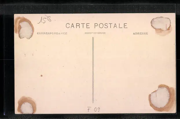 Personenbezogene Daten auf der Rückseite der Karte wurden durch blauen Textmarker unkenntlich gemacht. Die blauen Stellen sind auf die Vorderseite durchgeweicht und wirken sich negativ auf das Postkartenfoto aus