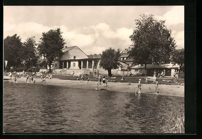 AK Mirow /Meckl., Bad und Strandhalle mit Badegästen