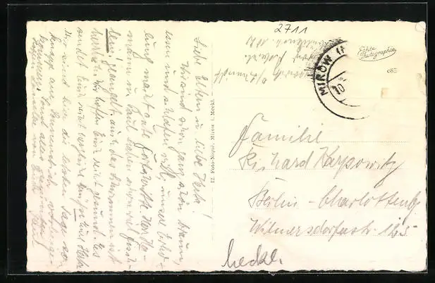 Personenbezogene Daten auf der Rückseite der Karte wurden durch blauen Textmarker unkenntlich gemacht. Die blauen Stellen sind auf die Vorderseite durchgeweicht und wirken sich negativ auf das Postkartenfoto aus