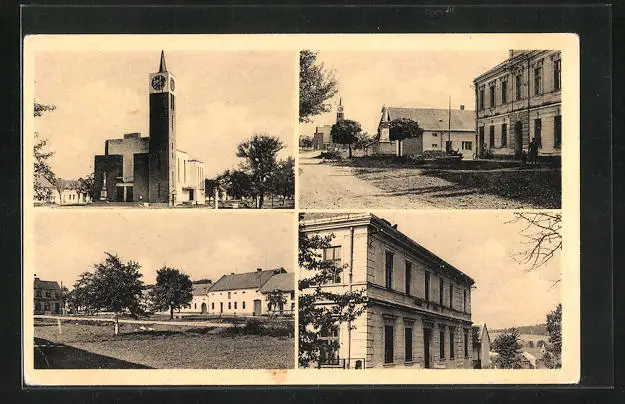 AK Mískovice, Strassenpartie, Blick zur Kirche