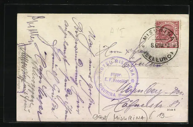 Personenbezogene Daten auf der Rückseite der Karte wurden durch blauen Textmarker unkenntlich gemacht. Die blauen Stellen sind auf die Vorderseite durchgeweicht und wirken sich negativ auf das Postkartenfoto aus