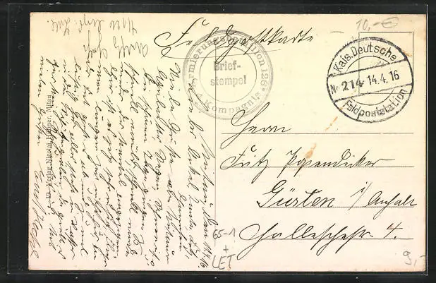 alte Ansichtskarte, gelaufen 1914 als Feldpost, Eckknick re. oben, guter Zustand